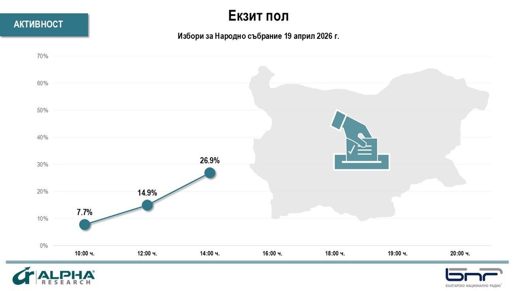 К 14:00 ч. явка избирателей составила 26,9 %, что на 2 % больше, чем на предыдущих выборах в 2024 году. Это показывают данные социологического агентства Alfa Research, партнера БНР в освещении досрочных парламентских выборов 19 апреля в Народное собрание 52-го созыва.