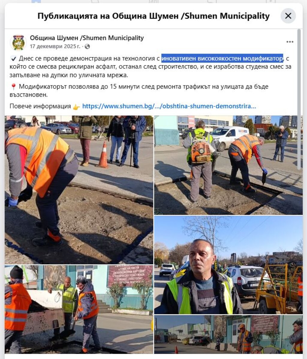 Пред зам.-кметът на Шумен Андреан Ваньов и служители на общинската строителна дирекция беше обяснено, че тази технология със студена смес се използва за улични ремонти във Варна и Провадия и че не е проблем запълването на дупки да се прави и през зимата. До 15 минути след ремонта трафикът може да бъде възстановен, уточни представител на фирмата.