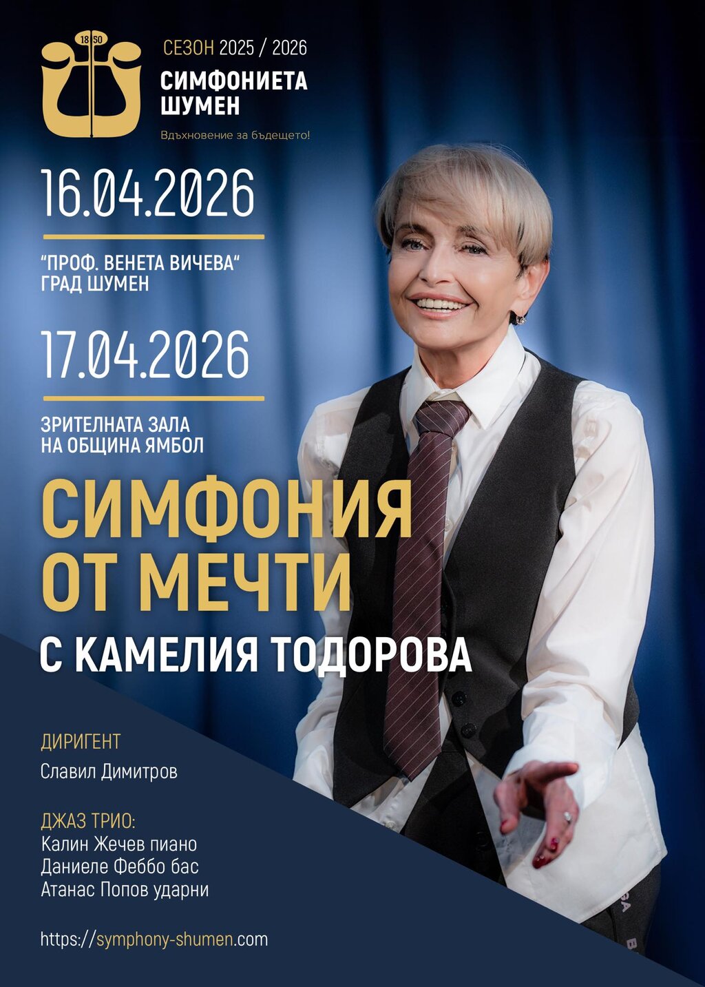 Класиката и поп музиката намират своята среща на сцената тази вечер с участието на Симфониета Шумен и известната ни изпълнителка Камелия Тодорова.