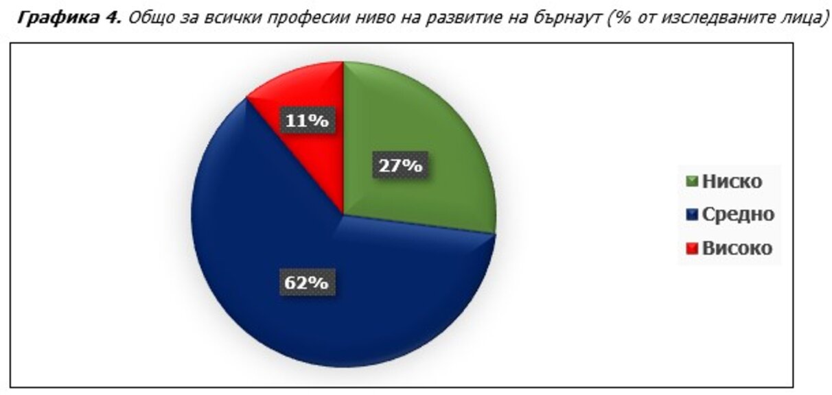 Обобщените резултати показват, че засегнати от синдрома на професионално прегаряне са преобладаващата част от изследваните лица, като 62% са на средно ниво и 11% на високо ниво на развитие на бърнаут. Той се развива най-интензивно при ръководители и специалисти маркетинг и продажби, и специалисти информационни и комуникационни технологии.