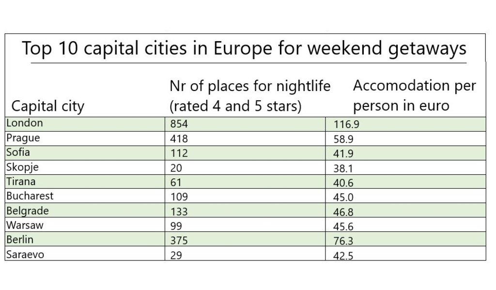 Sipas komenteve, në Sofje ka shumë vende të bukura dhe mundësi për argëtim. Pozicioni i parë është për Londrën me mbi 854 vende me vlerësim të lartë. Por turistët paguajnë një kosto më të lartë për fjetje për një natë prej 116,9 euro për person. Pozicioni i dytë është për Pragën, e cila gjithashtu ofron mundësi për eksperienca argëtuese dhe kulturore. Sofja zë vendin e tretë me 112 vende të vlerësuara dhe 41.9 euro për person për akomodimin për një natë.