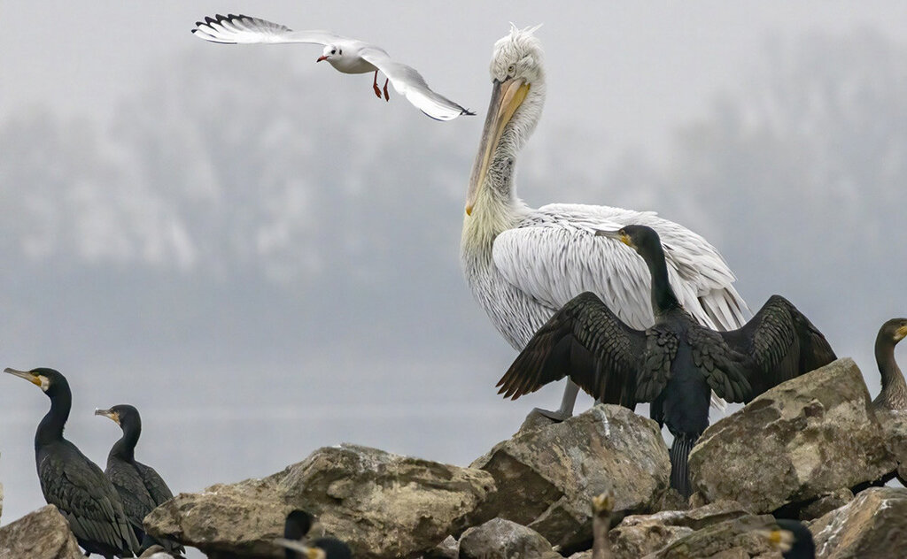 Vrançi i madh (Phalacrocorax carbo), pelikani kaçurrel (Pelecanus crispus) dhe pulëbardha