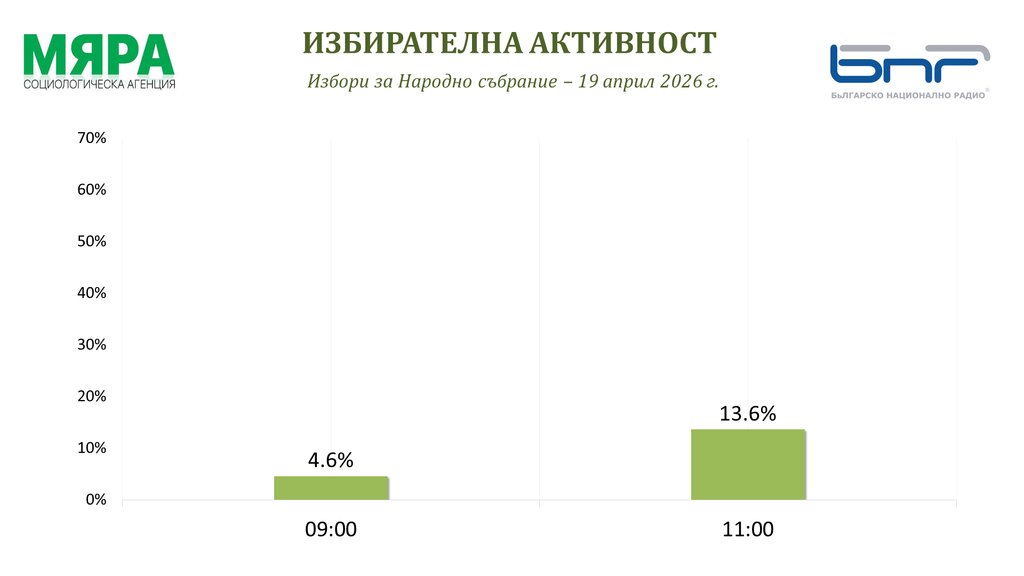 Sipas të dhënave në orën 09:00, pjesëmarrja mesatare në votime për vendin është 4.6%, tregojnë të dhënat e Agjencisë Sociologjike “Mjara”, partnere e Radios Kombëtare Bullgare në pasqyrimin e procesit zgjedhor.