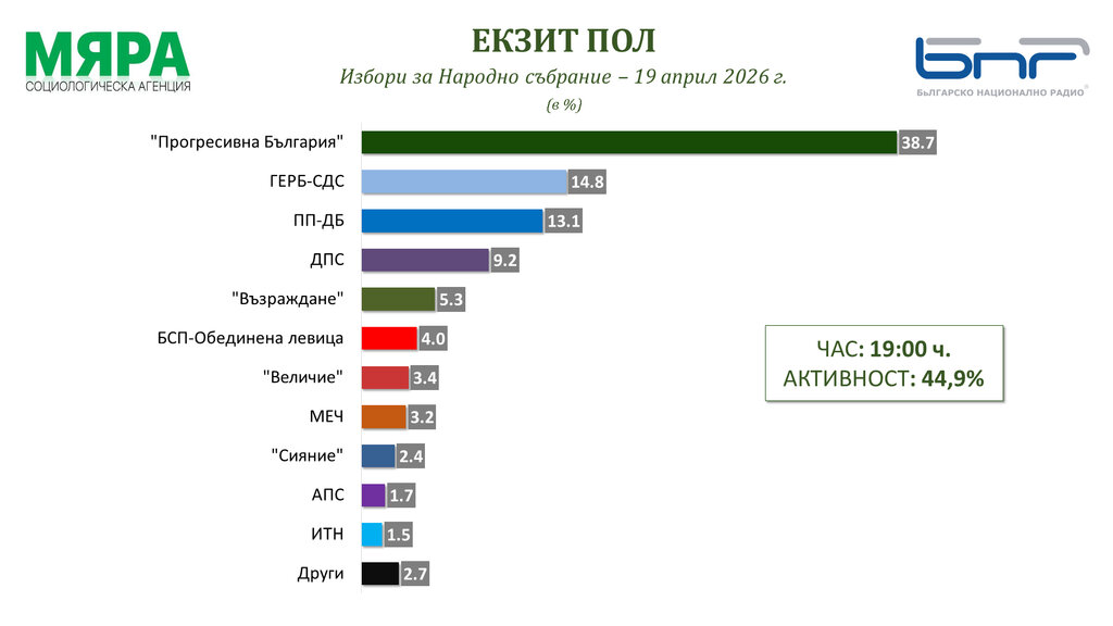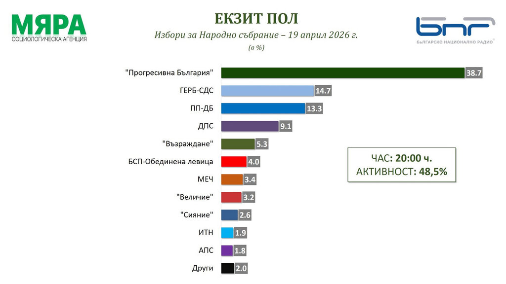 Rezultatet e exitpoll-it të agjencisë sociologjike “Mjara”, njëra nga dy agjencitë partnere të Radios Kombëtare Bullgare në pasqyrimin e votimit, tregojnë se 5 parti dhe koalicione janë të sigurta për të hyrë në Kuvendin e 52-të, ndërsa njëra është në prag të kufirit prej 4 për qind.