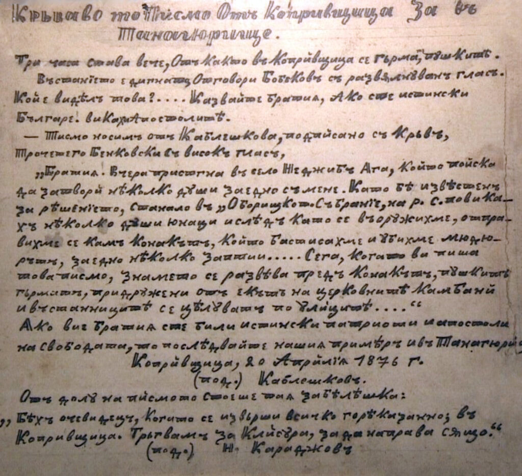të ketë pasur një kryq, të vizatuar me gjakun e vetë Kableshkovit. Pas prillit të vitit 1876, shprehja “Letra