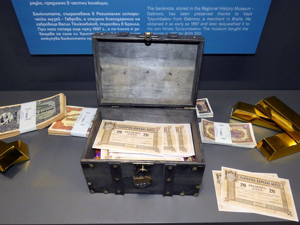 Në Muzeun Historik Rajonal të Gabrovos është ekspozuar një “copë letër” modeste drejtkëndëshe me përmasa 10 me 15 cm. Kjo është kartëmonedha e parë bullgare – një njësi prej njëzet levash me numër serial 000001. Është shtypur më 1 gusht 1885 në Shën Petersburg, dhe gjatë këtij viti 2025 shënohen 140 vjet nga krijimi i saj.