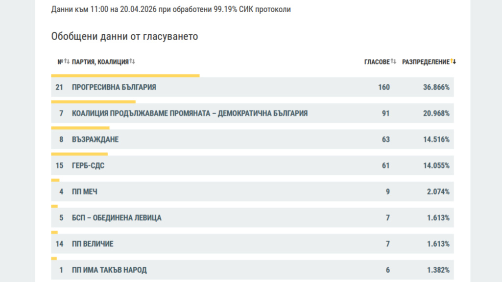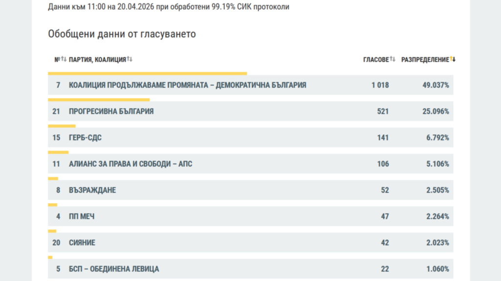 Формација „Настављамо промену – Демократска Бугарска“ (НП-ДБ) остварила је најбољи резултат на ванредним парламентарним изборима 19. априла на пет бирачких места у Србији, показују подаци које је ЦИК објавила на основу скоро 100% обрађених записника бирачких одбора.
