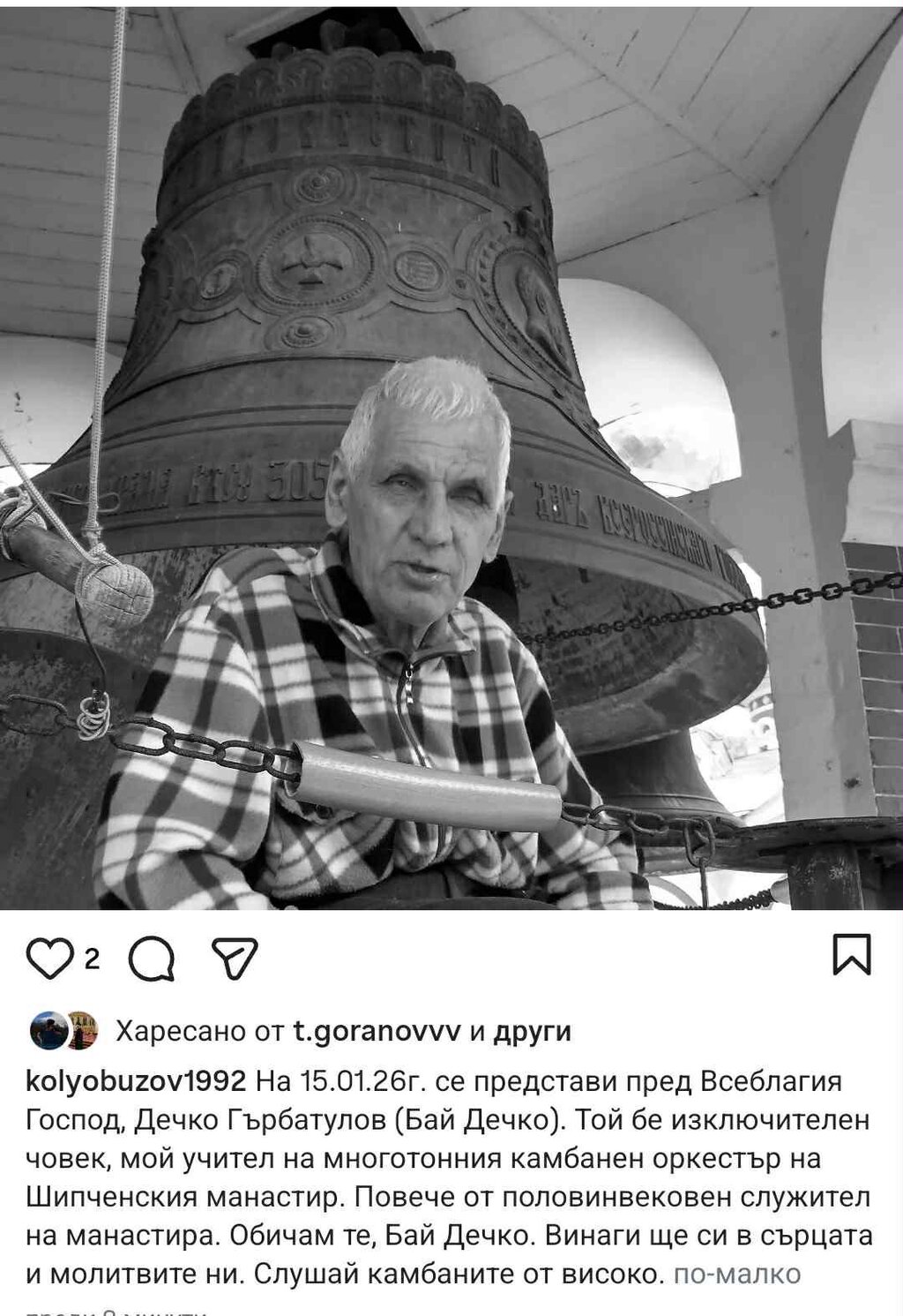 "Той бе изключителен човек, мой учител на многотонния камбанен оркестър на Шипченския манастир. Повече от половин вековен служител на манастира. Винаги ще си в сърцата и в молитвите ни. Слушай камбаните отвисоко", написа архимандрит Панкратий.