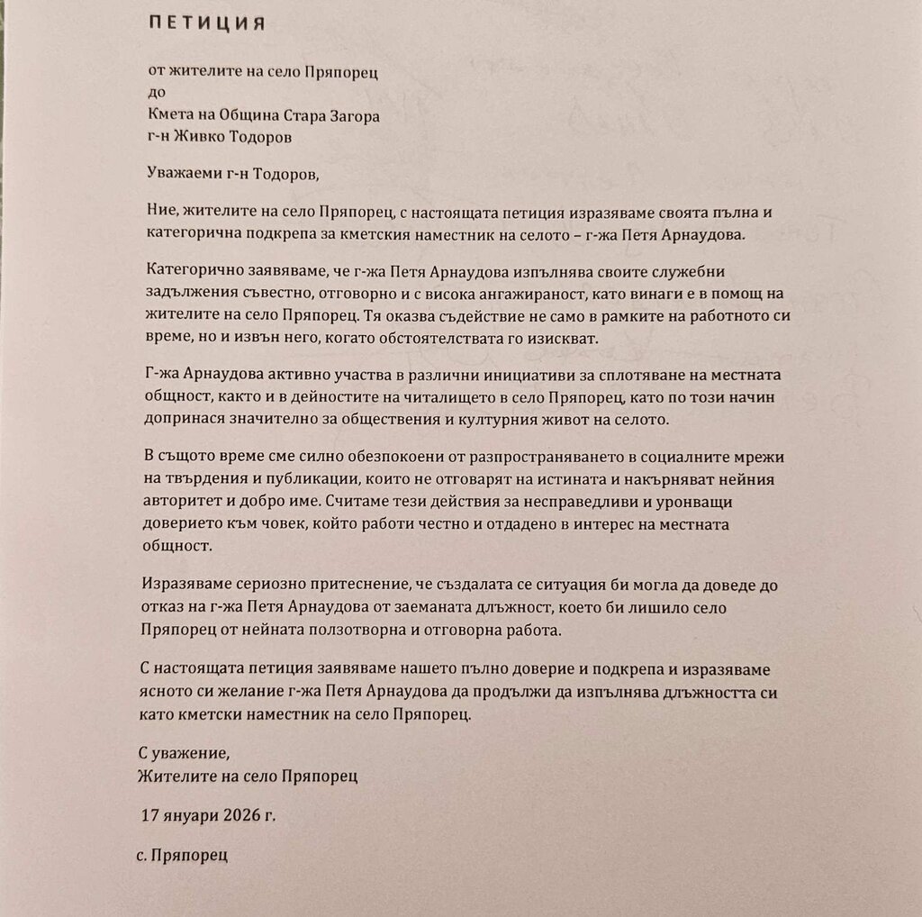 „Силно сме обезпокоени от разпространението на твърдения и публикации, които не отговарят на истината и накърняват нейния авторитет и добро име. Изразяваме сериозното си притеснение, че създалата се ситуация би могла да доведе до отказ на г-жа Арнаудова от заеманата длъжност, което би лишило село Пряпорец от нейната ползотворна и отговорна дейност.“ Това пише в петиция, подписана от повече от 100 жители на селото, изпратена до Община Стара Загора в подкрепа на кметския им наместник.
