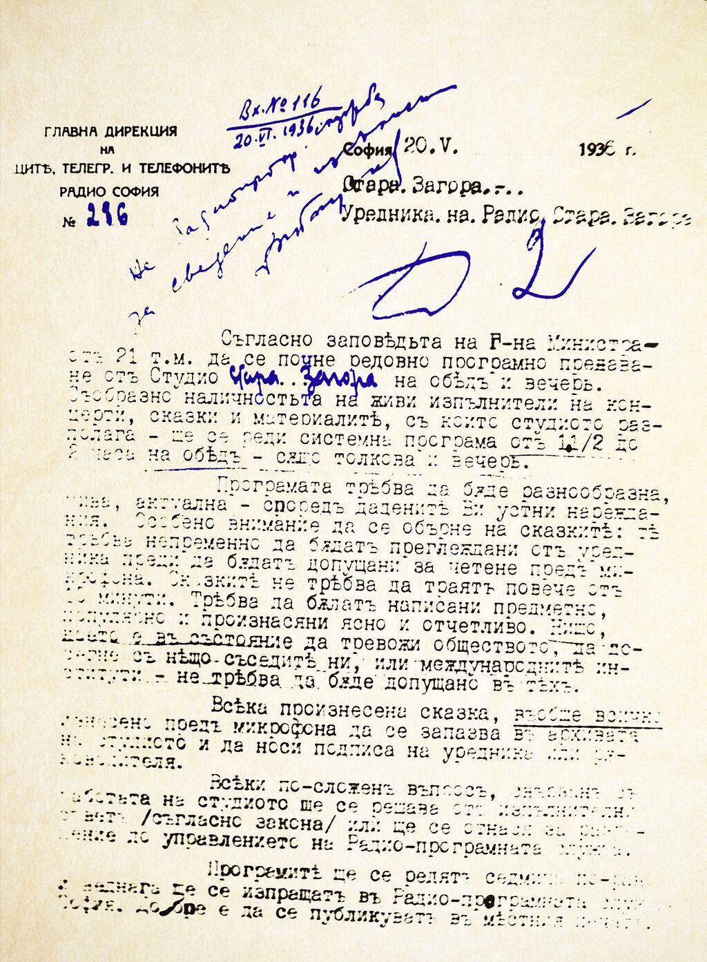 Разпоредбата на Сирак Скитник от 20 май, 1936 год., която поставя началото на Радио Стара Загора