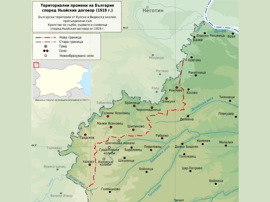 Bundan tam 104 yıl önce Birinci Dünya Savaşının sonundan sonra 27 Kasım 1919 tarihinde imzalanan Neuilly Antlaşmasına göre Bulgaristan, savaşmadan öz topraklarından 1 545 metre kareyi kaybetti. 1920 yılının 6 ile 8 Kasım günleri arasında Sırp birlikler, Tsaribrod, Bosilegrad ve Strumitsa illerini işgal etti. 25 köy ve Bulgar şehirleri Trın ve Kula’ya ait toprakların bir kısmı, sözüm ona kara hudutla bölünerek bugünkü Sırbistan’ın sınırları içerisinde kaldı.