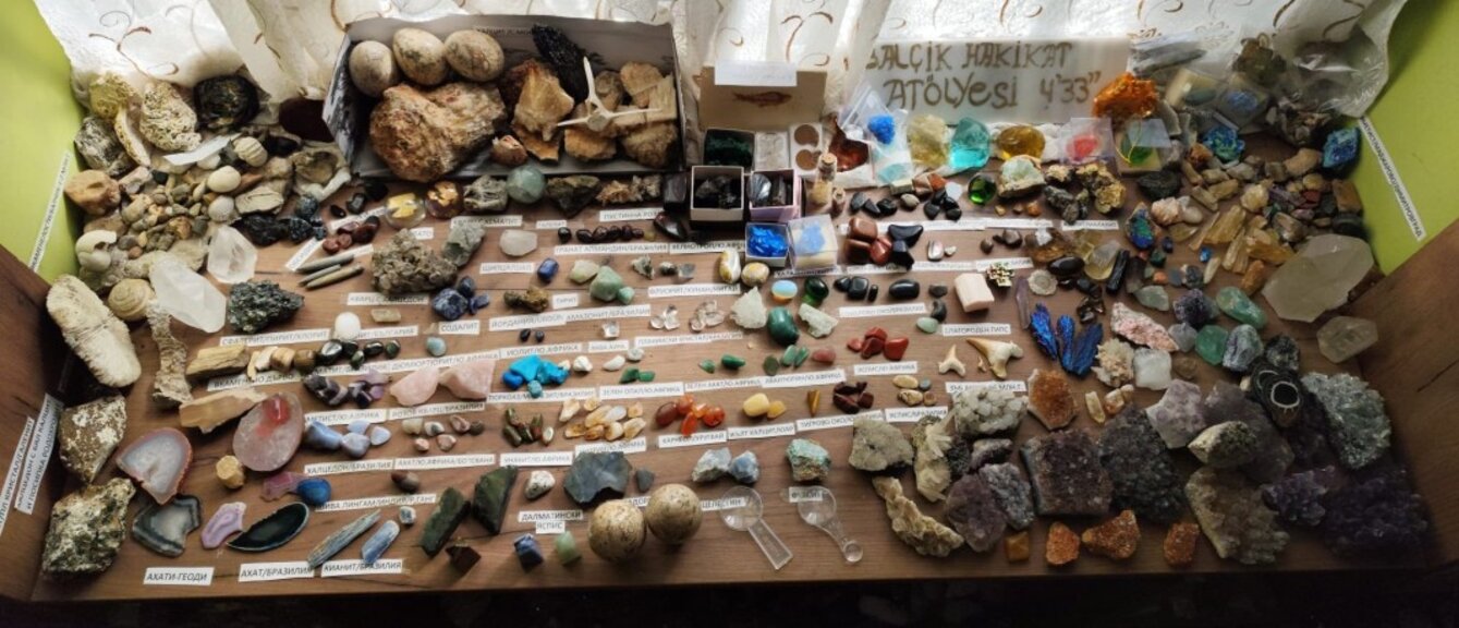 Felsefe, psikoloji, kişisel gelişim konularının yanı sıra, bir de doğal taşlara ilgi duyan Ehlin Bey, camide sergilenen, mineraller, doğal taşlar, yarı değerli, tam değerli taşlardan ve 150 milyon yıllık fosillerden oluşan çok zengin bir koleksiyona sahip.