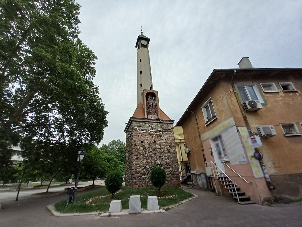 Orijinal saatinin bulunduğu nişte, Pazarcik'in himayecileri Az. az. Konstantin ve Elena'nın heykelleri bulunuyor.