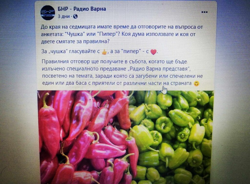 В много от големите хранителни вериги обаче срещаме етикети, на които пише "чушки". В началото на седмицата пуснахме анкета и на фейсбук страницата на Радио Варна, в която се включиха стотици хора от различни краища на страната. До вчера, резултатът беше 190 гласа за "пиперката" и 89 гласа за "чушка". Вие също можете да гласувате и споделите вашето мнение в