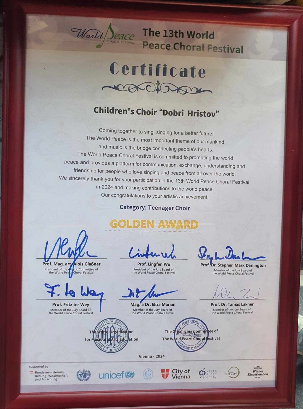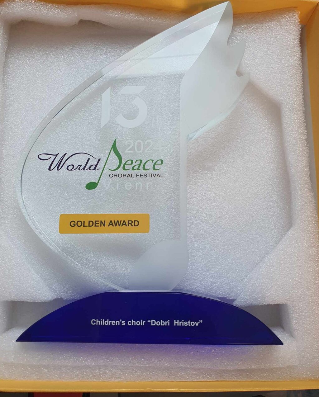 Варненският детски хор „Добри Христов“ към Общинския детски комплекс спечели първата награда и златния медал в 13-ото издание на Световния фестивал за мир в австрийската столица Виена.