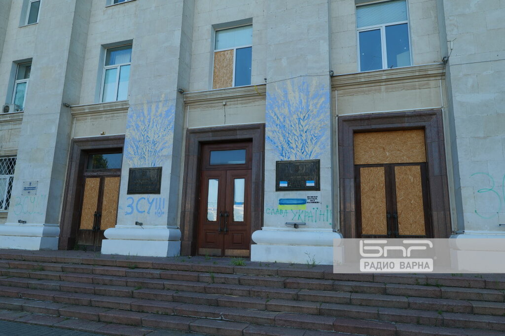 Жълто-сините надписи още се виждат по стените на Херсонската областна администрация, както и на някои от намиращите се край площада сгради. В петъчната юнска сутрин количеството на графитите е далеч по-голямо от това на хората.