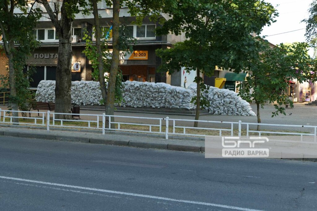 В юнската сутрин слънцето започва да осветява все повече и повече пространствата в Херсон, странно отразявайки белотата на чинно подредените и напълнени с пясък чували с височина около ръста ми пред някои от сградите. Разминаваме се с градски автобус с трима пътника.