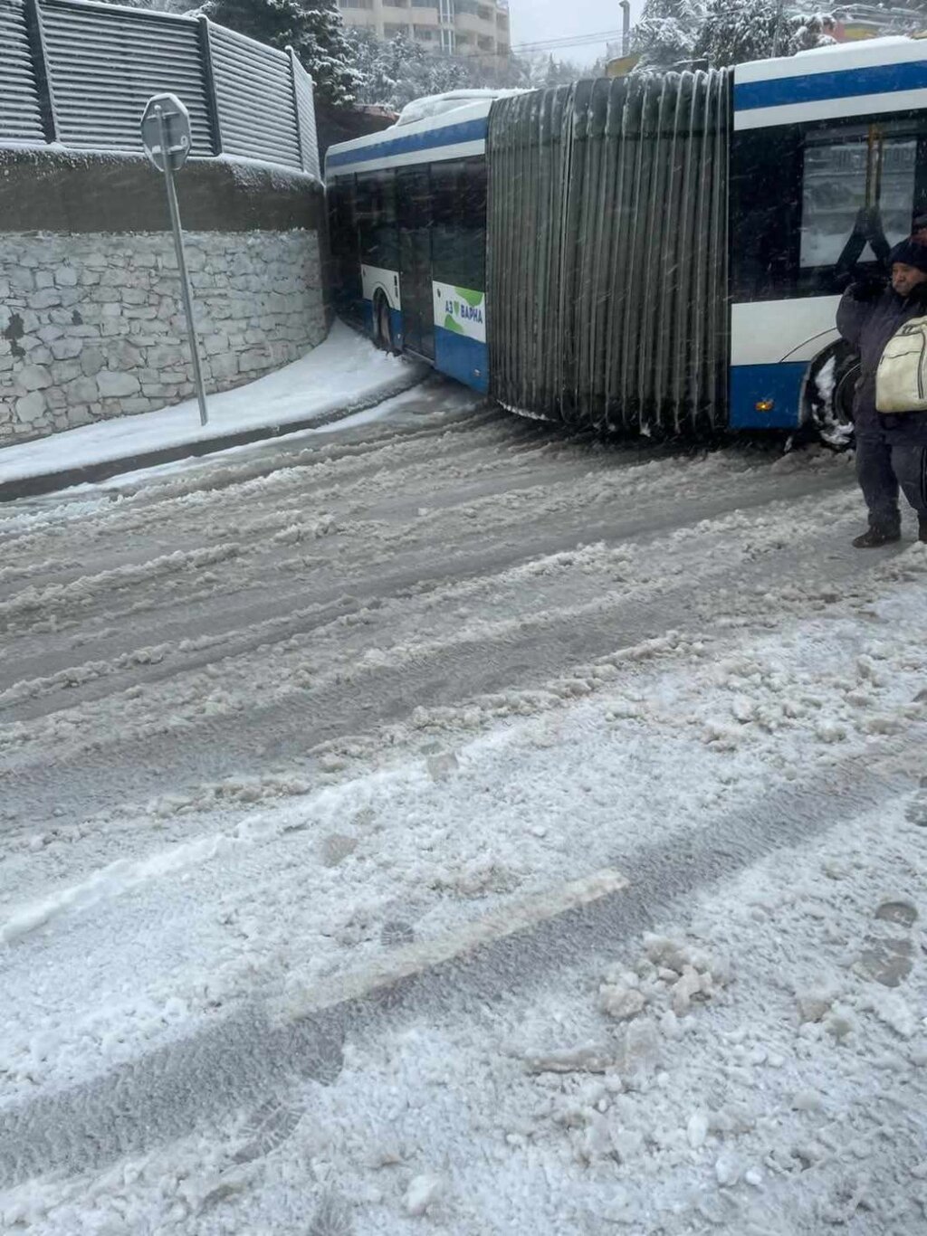 Автобус по линия номер 13 на улица "Студентска" в близост до ОУ "Черноризец Храбър" във Варна буксува тази сутрин заради усложнената пътна обстановка и стана причина за задръствания в района, на улица "Мир" друго превозно средство от градския транспорт по същата линия не успя да потегли.