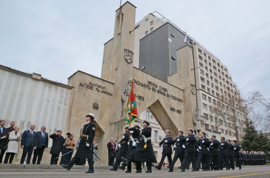 Почетният караул и Представителният духов оркестър на Военноморските сили преминаха в тържествен марш пред „Портал-паметник на Осми приморски пехотен полк“.