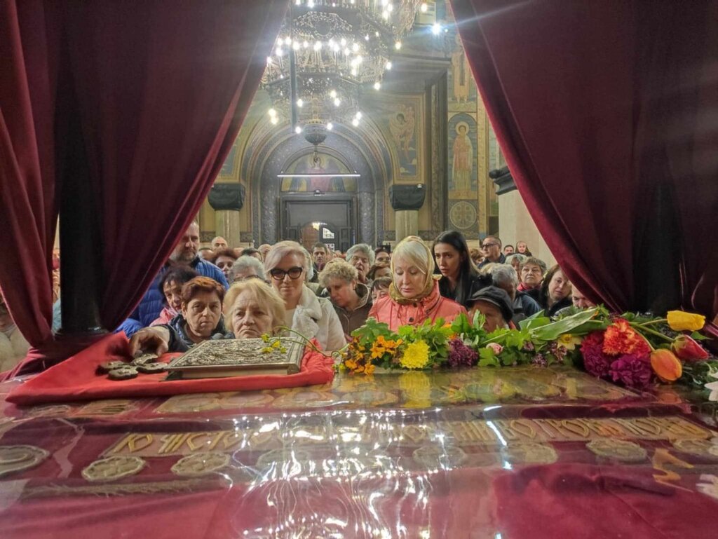 Хората изчакват преминаването под плащеницата в катедралния храм "Успение Богородично".