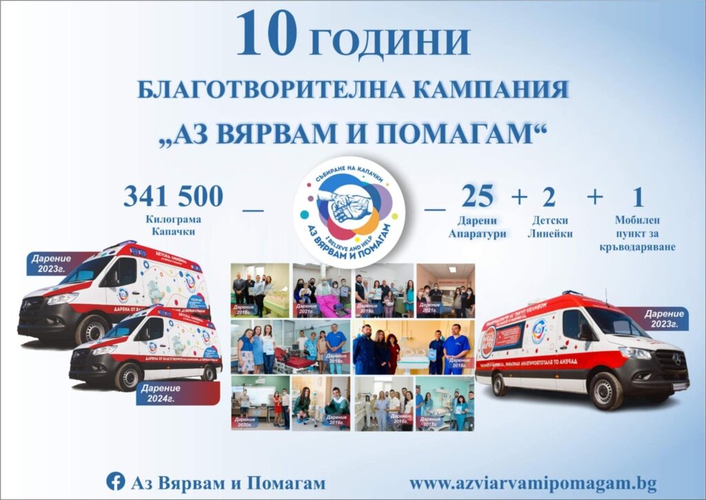 Припомняме, че благотворителна кампания "Аз Вярвам и Помагам" е създадена през 2015 г. в град Варна и за последните 10 години дари над 25 броя животоспасяващи медицински апаратури, оборудване, техника, медицински инструментариум, две детски /неонатални/ линейки "Аз Вярвам и Помагам" и първият в България мобилен пункт за кръводаряване "Аз Вярвам и Помагам" в помощ на милиони бебета, деца и възрастни в България.