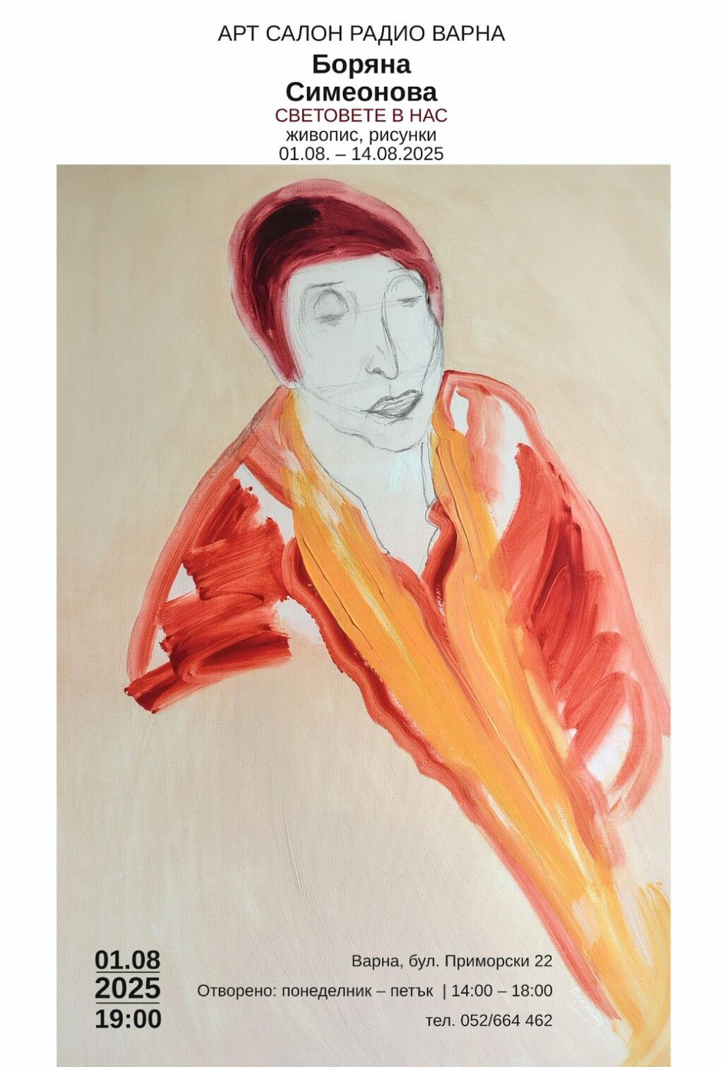 1 август, петък, Арт салон на Радио Варна, 19.00 часаСамостоятелна изложба на Боряна Симеонова "Световете в нас" - живопис и рисунка.