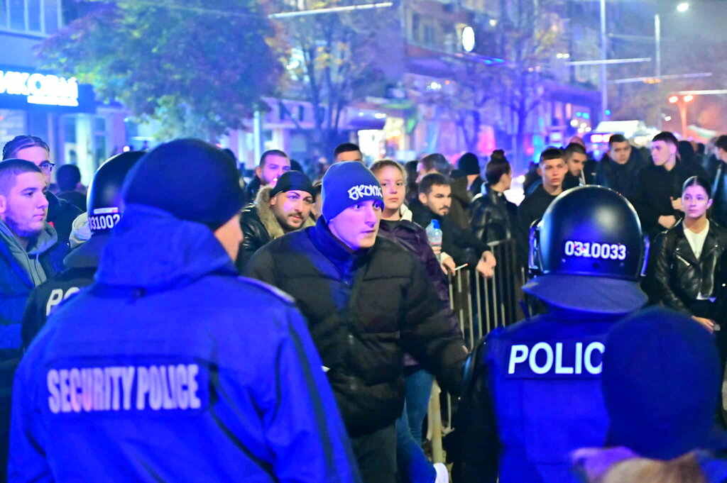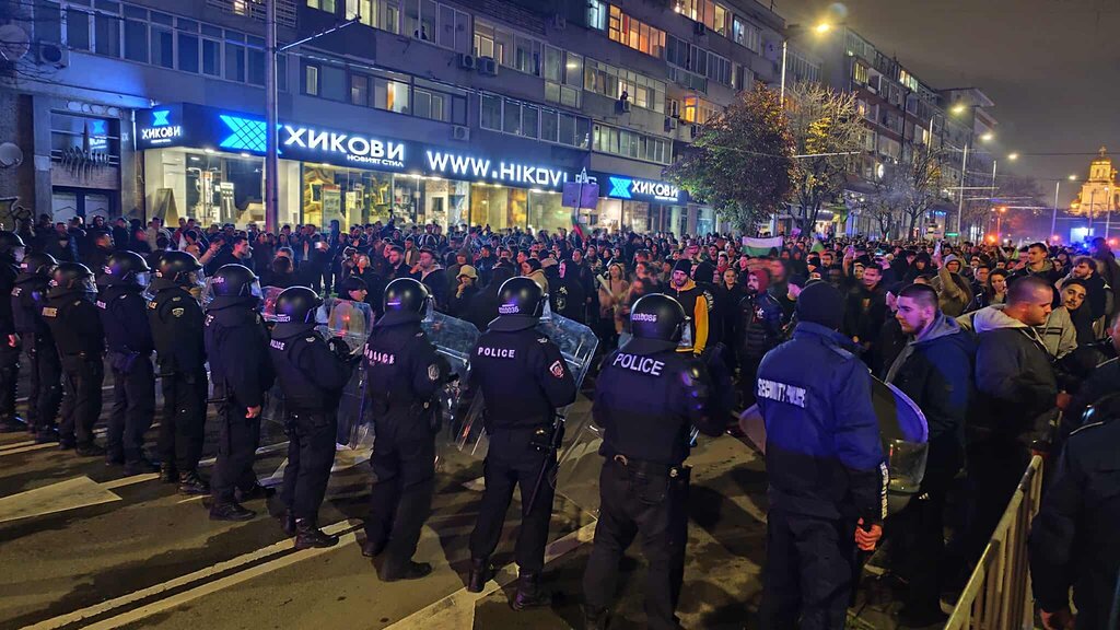 Полицейски кордон спря шествието и желанието на протестиращите да се насочат към Аспаруховия мост, за да блокират съоръжението. Екипите на Областната дирекция на МВР са със свалени щитове. Сред демонстрантите има представители на футболни агитки. Има двама задържани.