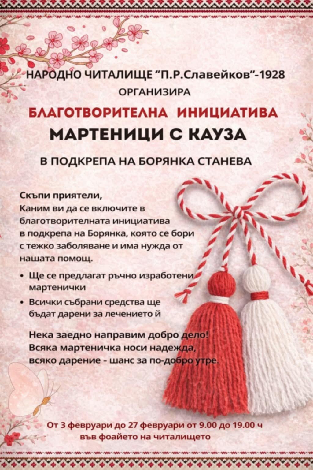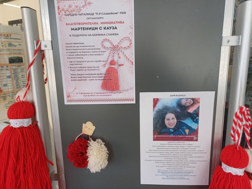 Служителите на читалище "Петко Рачев Славейков" в квартал Владиславово организират благотворителна инициатива под наслов "Мартенички с кауза". Те изработват и продават ръчно направени мартеници, а събраните средства ще бъдат дарени в подкрепа на млада жена от квартала – Борянка Станева, която води тежка битка с рака на гърдата.