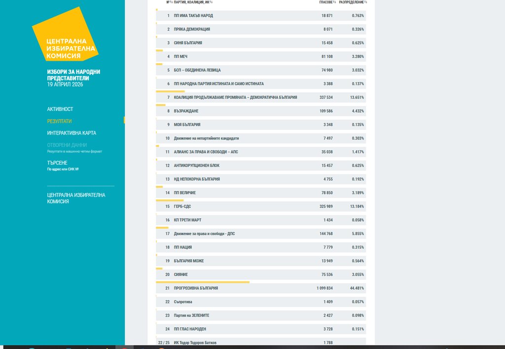 В цялата страна за "Прогресивна България" са гласували 1 099 834 души, което им дава 44.481% подкрепа, става ясно при обработени 78.24% СИК протоколи в РИК.