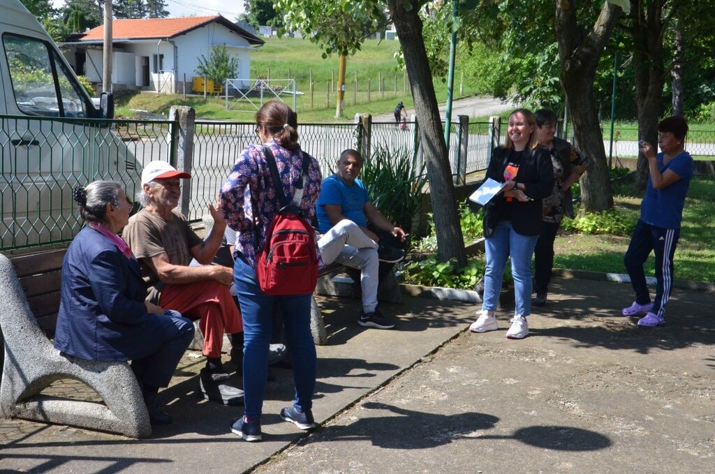 На площада в селото срещам много хора, майки с деца, ученици, възрастни, те са в малката озеленена градинка пред кметството, която ухае на рози и липи: