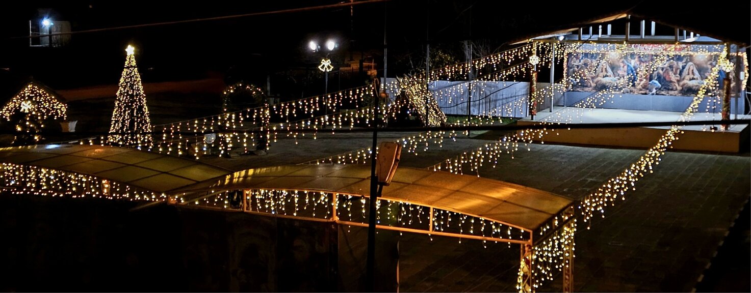 Имаме два винила, които изобразяват сцената на Рождество Христово, обща дължина 8 метра, колкото е сцената, осветени са...Задължително е всички да пазят коледната украса!