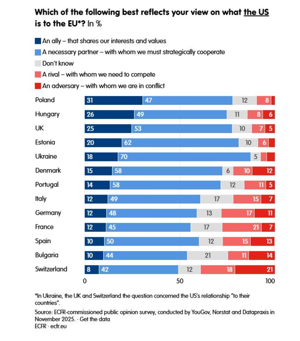 ECFR deputy director Vesela Cherneva said that only 16% of Europeans see the United States as an ally, while the majority consider it a necessary partner that may also act as an opponent in some respects.