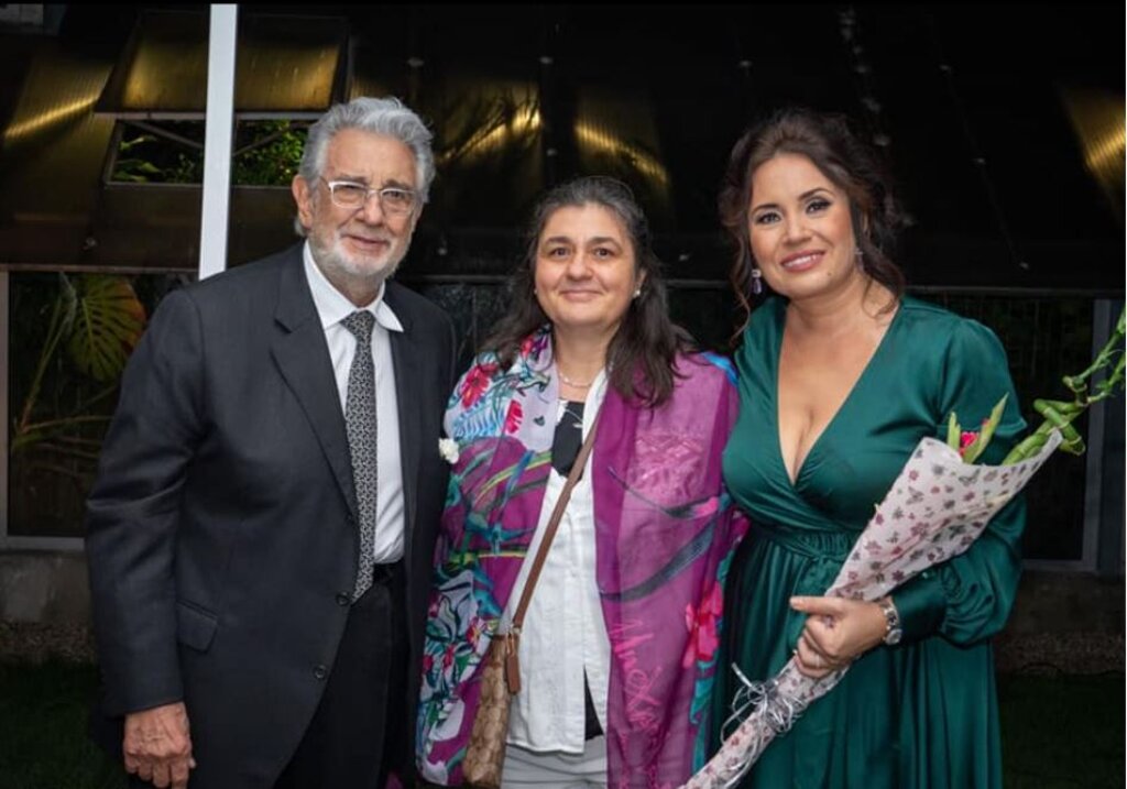 Neli Koycheva (centre) with her former student, soprano Sonya Yoncheva, and tenor Plácido Domingo.