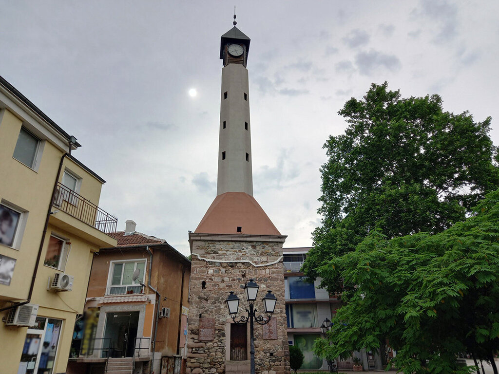 En el lugar donde se encontraba el reloj original hay esculturas de los santos patronos de Pazardzhik: los santos Constantino y Elena.