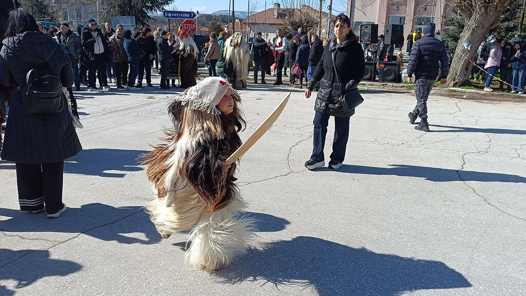 La journée s’est ouverte sur les traditions de Sirni Zagovezni : les femmes forment des rondes et entonnent des chants. Puis vient le moment le plus attendu. Surgissent alors, sur la place du village, les koukeri – appelés djoumals à Kalouguérovo, derviches à Lessitchovo – escortés d’"Arabes" au visage noirci de suie. Revêtus de costumes traditionnels ou drapés dans de lourdes peaux de chèvre aux longs poils, ils sont ceints d’innombrables cloches dont le fracas emplit l’air et captive la foule. Les plus jeunes, grimés à leur tour, vivent leur métamorphose avec un bonheur manifeste.