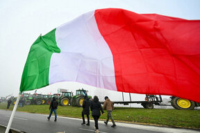 Италианските фермери протестират с тракторите си, като са поставили транспарант: "Няма фермери, няма храна, няма бъдеще", до изхода на магистрала в Бреша, Италия, 31 януари 2024 г.