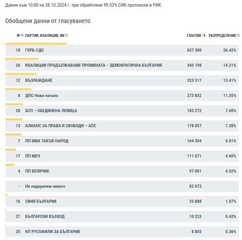 Резултати от парламентарните избори на 27-и октомври (при 99,03% обработени протоколи)