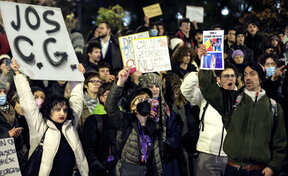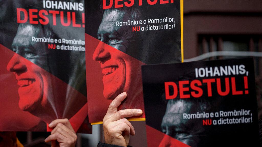 Симпатизанти на Алианса за обединение на румънците с плакати: Йоханис, достатъчно – Румъния не принадлежи на диктатори, Букурещ, 8 декември 2024 г.