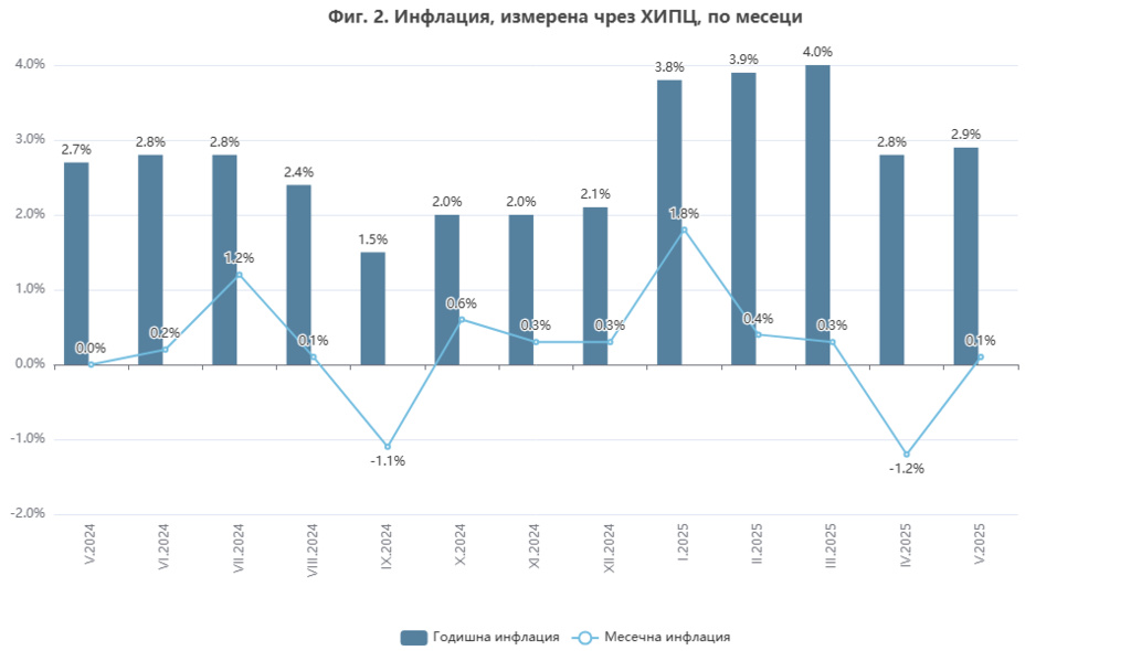 Хармонизираната инфлация (индексът HICP според общите европейски стандарти) през май 2025 г. се повишава с 0,1% на месечна база, докато хармонизираната потребителска инфлация на годишна база се ускорява леко до 2,9% от 2,8% през предходния месец.