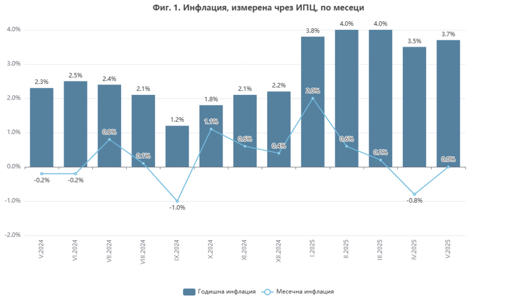 Средногодишната инфлация за периода юни 2024 - май 2025 г. спрямо периода юни 2023 - май 2024 г. е 2,8%, докато от началото на годината (май 2025 г. спрямо декември 2024 г.) инфлацията се повишава с 1,9 на сто.
