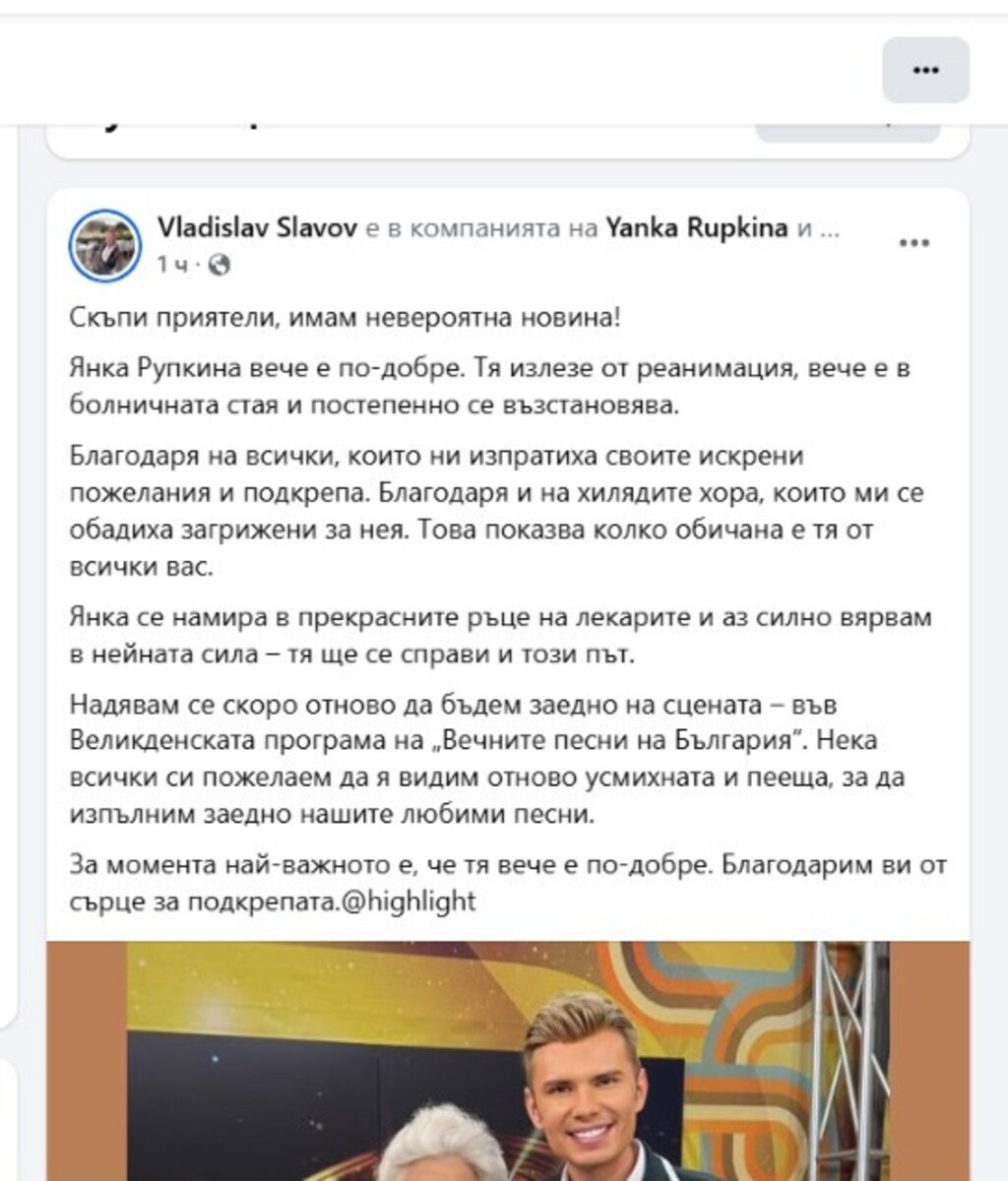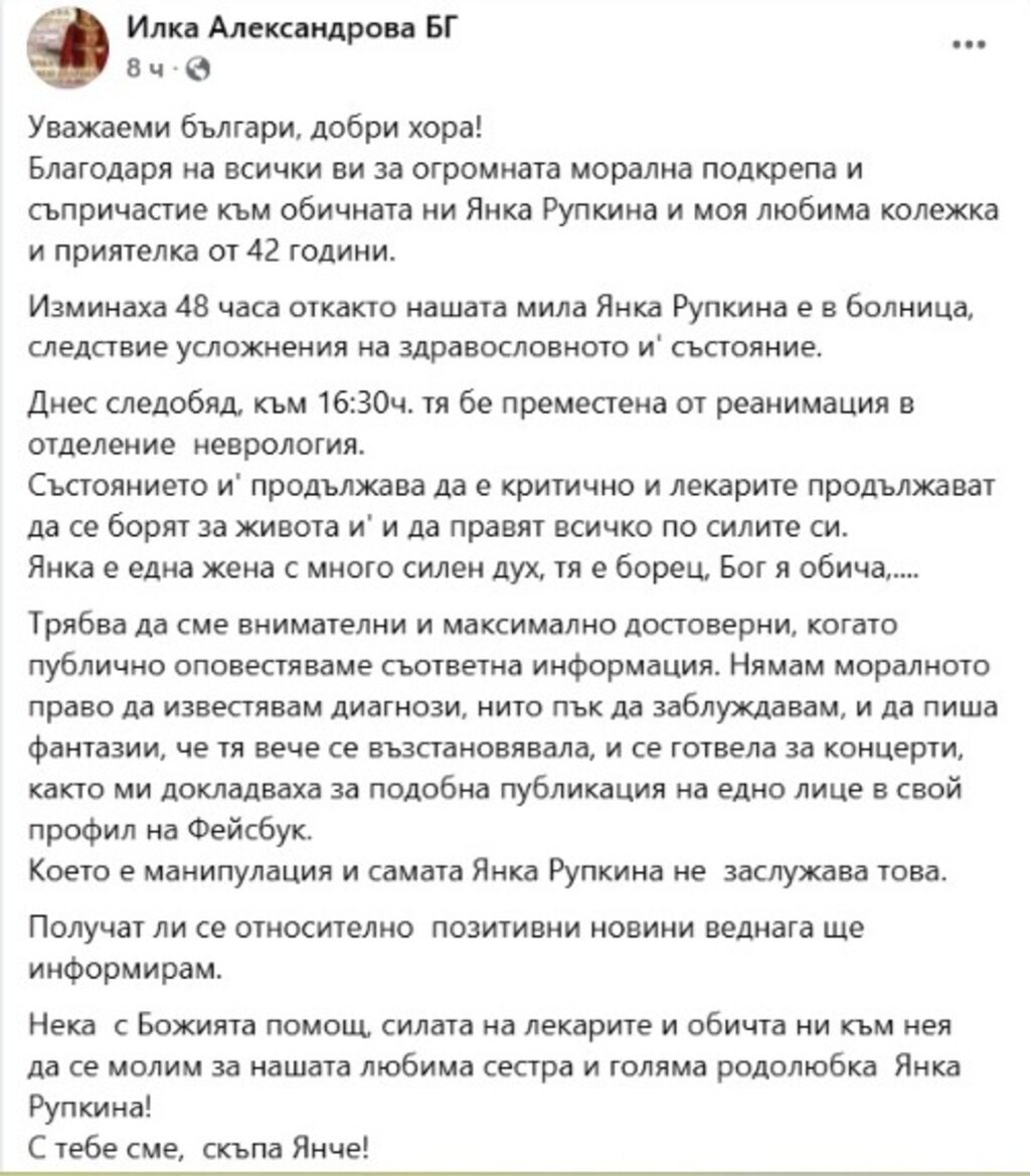 „Янка е жена с много силен дух, тя е борец“, пише още Александрова и призовава да се разпространява само достоверна информация за състоянието ѝ. Тя подчертава, че не бива да се публикуват непроверени твърдения или спекулации. Колежката на певицата уверява, че при появата на по-позитивни новини обществеността ще бъде своевременно информирана и призовава всички да се молят за здравето на голямата българска народна певица.