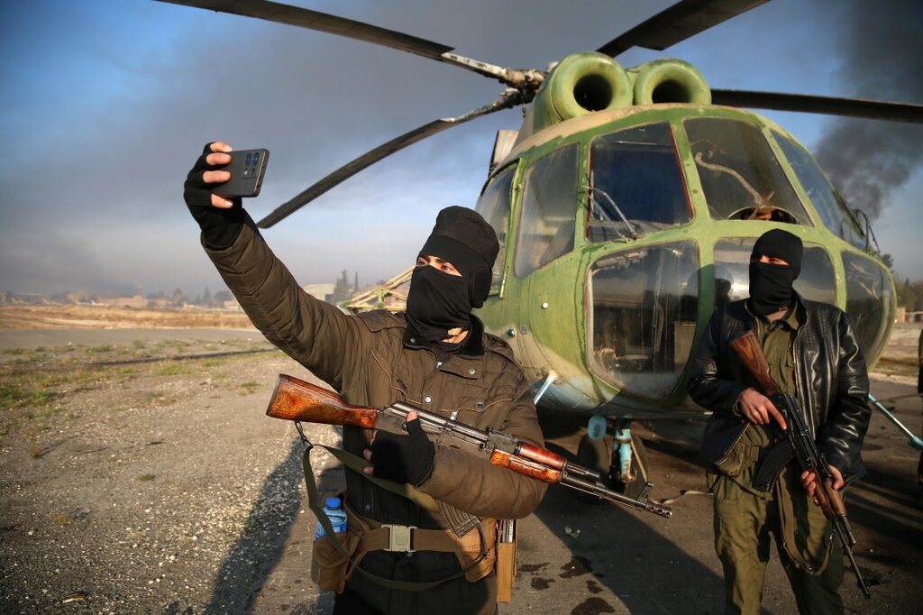 Въоръжени мъже се снимат след превземането на военно летище в Алепо, 2 декември 2024 г.