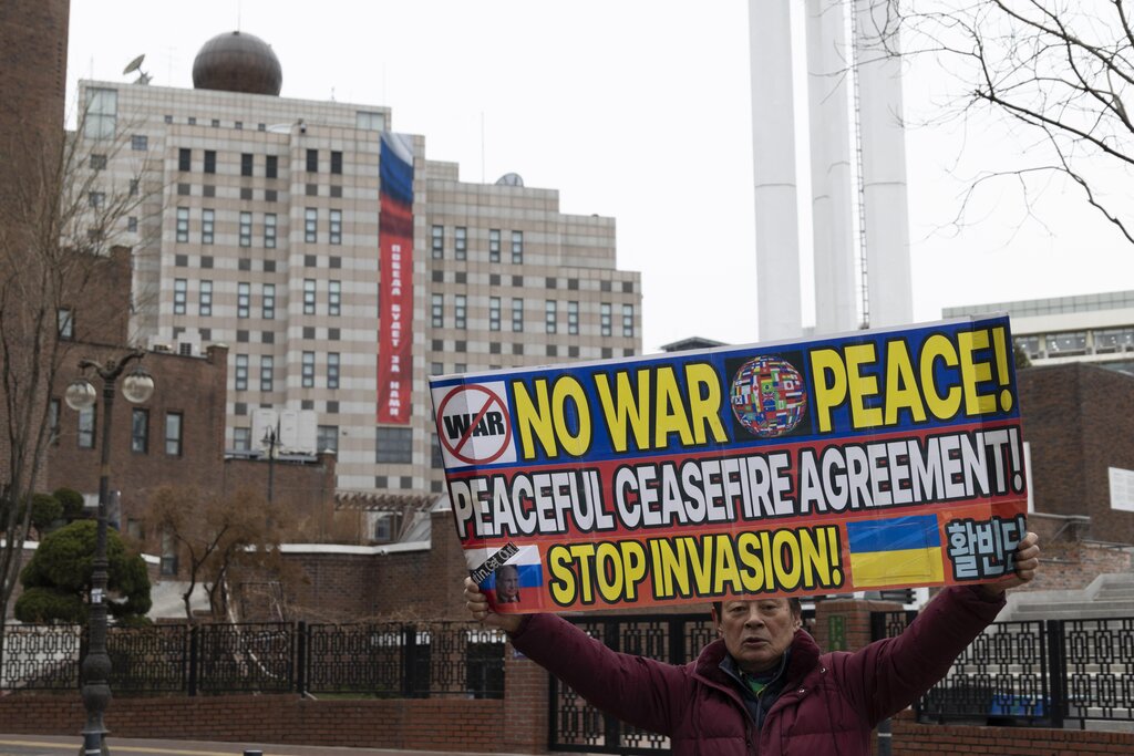 Протестиращ срещу руската война в Украйна пред руското посолство в Сеул, 24 февруари 2026 г.