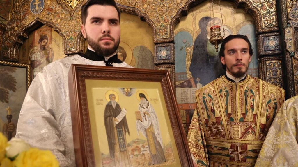 «Господь изображен сверху и они обращаются к Нему в молитве, - рассказала иконописец Екатерина Титова, автор иконы. - Двое святых изображены на фоне миниатюры, показывающей город Софию, кафедральный собор Св. Александра Невского, старинный храм Святой Софии, русский храм Св. Николая и памятник царю Освободителю. Слева от св. Иоанна Рильского изображен Рильский монастырь, а также пещера в горах, где находилась могила святого. Со стороны св. Серафима изображен храм Рождества Христова в городе Шипка. Когда я писала храм в Шипке, то искала подробную информацию о нем, потому что было очень важно изобразить его так, чтобы он был узнаваем».