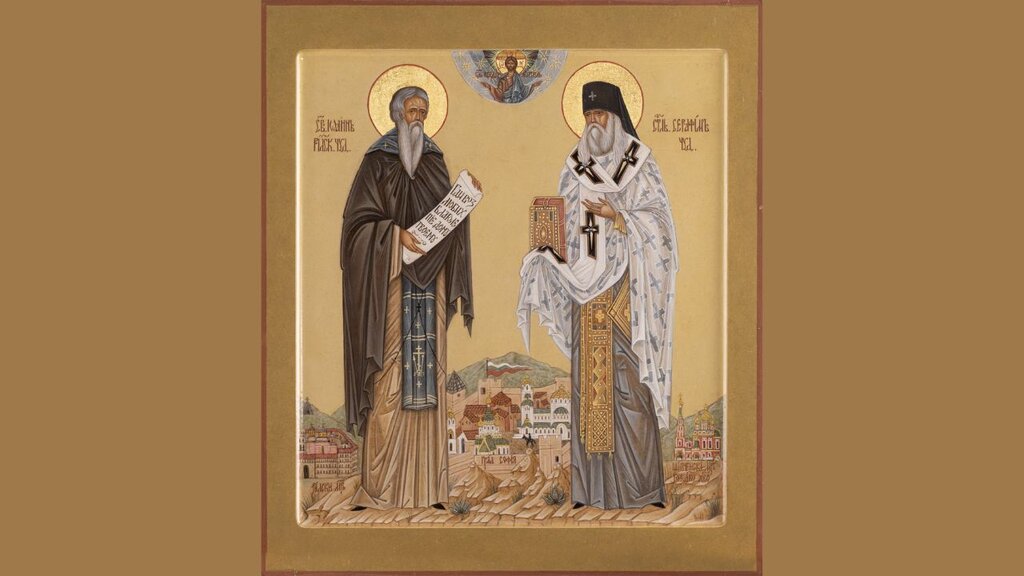 “Zoti është pikturuar lart dhe ata i drejtohen Atij në lutje – vëren ikonografja Ekaterina Titova, autore e ikonës. – Dy shenjtorët janë vendosur në sfondin e një miniaturë që paraqet qytetin e Sofjes, katedralen ‘Shën Aleksandër Nevski’, tempullin e lashtë ‘Shën Sofia’, Kishën Ruse ‘Shën Nikollaj’ dhe monumentin e Mbret Çlirimtarit. Në anën e shën Joan Rillskit, majtas, është Manastiri i Rillës, si edhe shpella në mal, ku ndodhet varri i shenjtorit. Në anën e shën Serafimit është paraqitur kisha në qytetin Shipka ‘Lindja e Krishtit’. Kur pikturova tempullin e Shipkës, kërkova në hollësi informacion për të, sepse ishte shumë e rëndësishme të paraqitej në mënyrë që të njihej. Kisha ndjesinë se isha pikërisht atje me ndihmën e Zotit.”